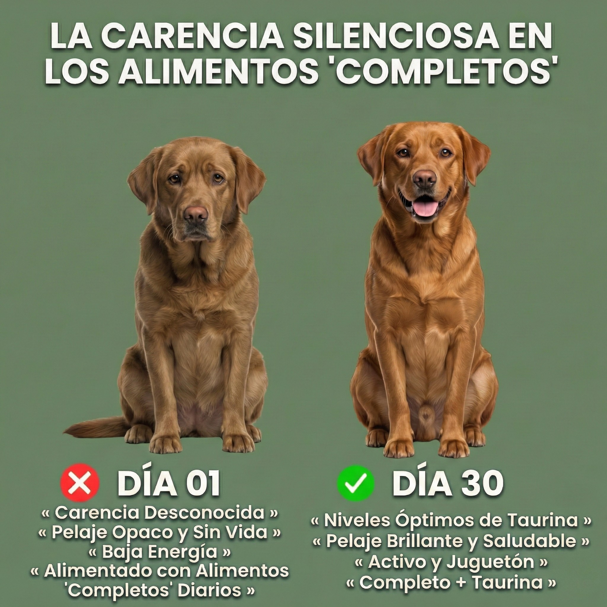 Aunque no note cambios inmediatos en su perro, las carencias de taurina a veces tardan meses en manifestarse. Suplementar ahora permite actuar de forma preventiva, antes de que aparezcan desequilibrios más graves.