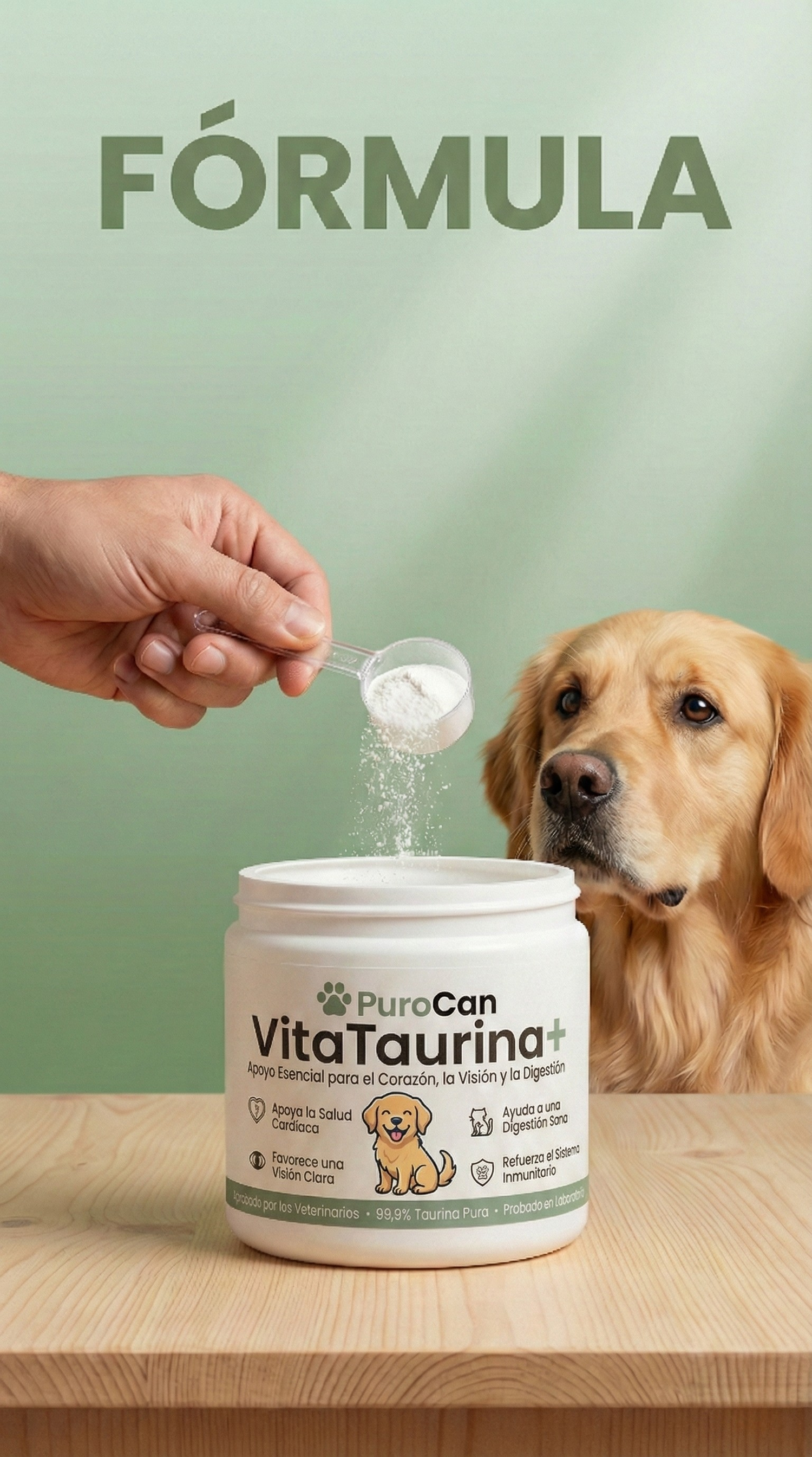 Una simple cucharada de VitaTaurina+, mezclada con la comida de su perro, aporta la taurina esencial que su organismo no puede producir por sí solo.